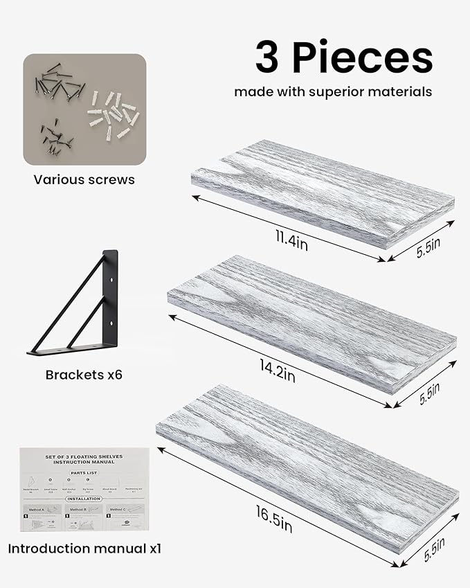 - 【Sturdier and Easy to Install: Large】16.5 × 5.5 × 4.6 inches; Medium: 14.2 × 5.5 × 4.6 inches; Small: 11.4 × 5.5 × 4.6 inches. These floating shelves are wider and sturdier than others to safely hold collectibles, photos, small plants and showcase favorite dishes or build your own coffee bar. Easy to assemble with all necessary hardware included according to the instruction steps.