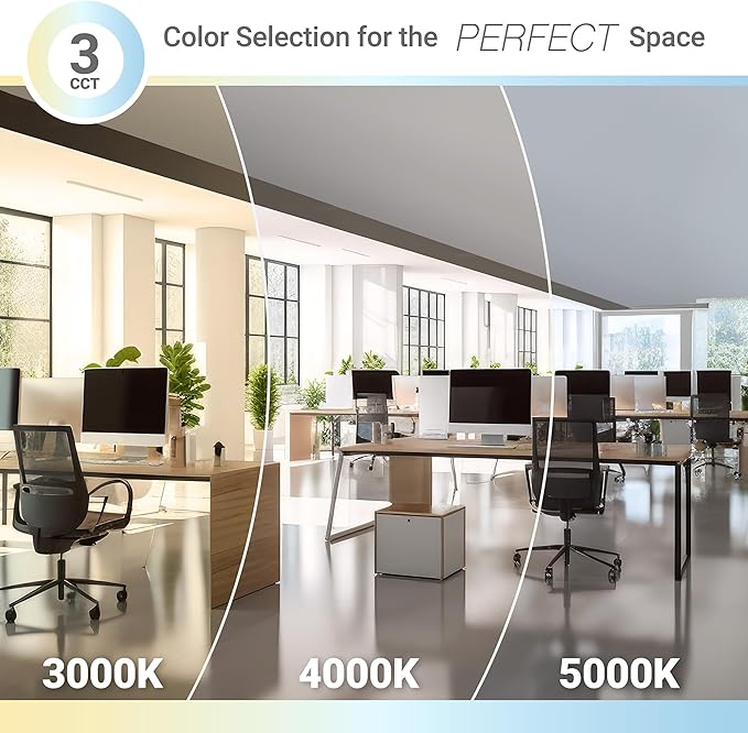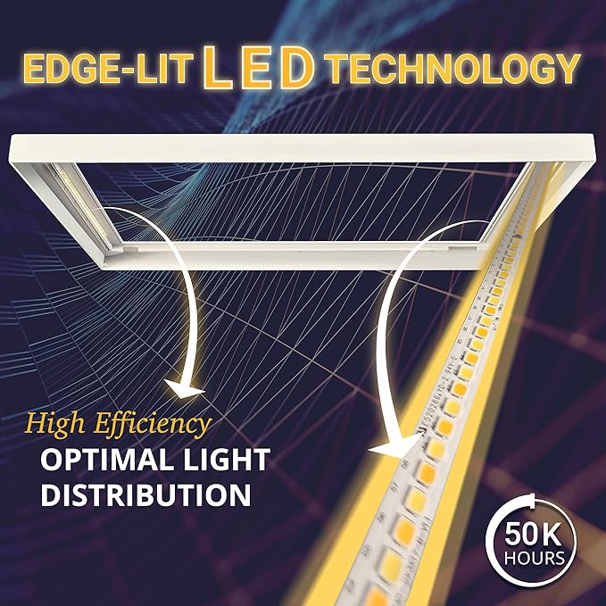 - BRIGHT DESIGN – Slim and efficient! With a 1-inch profile our ultra-thin 2x4ft LED panel packs a punch with 5500LM of even. No glare, no shadows, just radiant, eye-friendly illumination. Plus, with our upgraded heat sync you get the benefit of optimal heat dispersion throughout your 2x4 foot LED panel, for a longer lasting energy efficient performance.