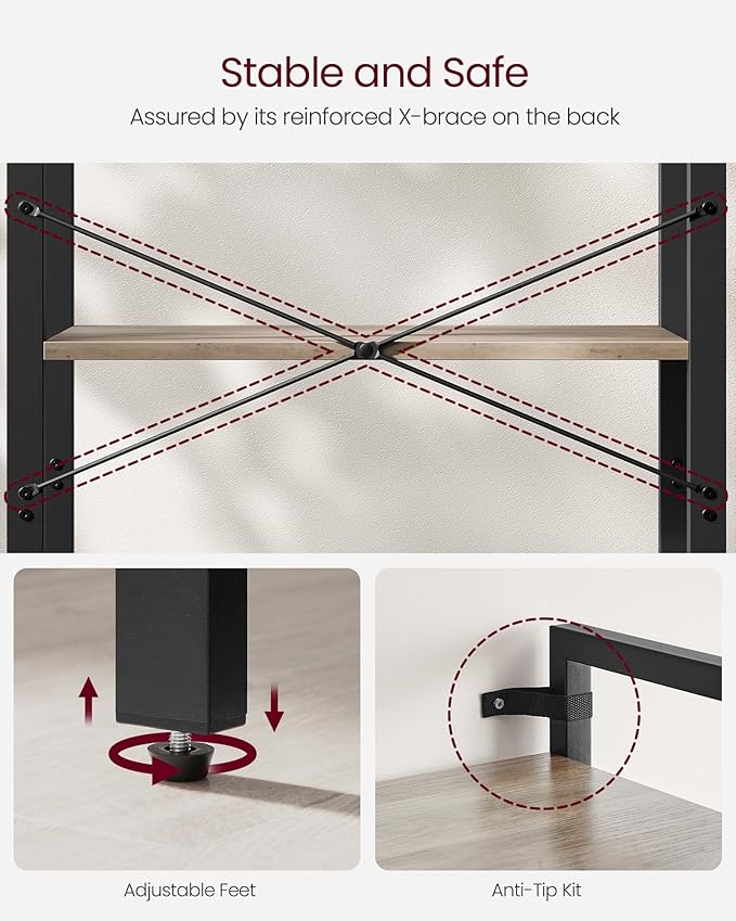 - Stable and Safe: X-brace reinforces the structure, adjustable feet keep this tall book shelf balanced on slightly uneven floors, and the included anti-tip kit will help you fix it to the wall for greater stability and safety