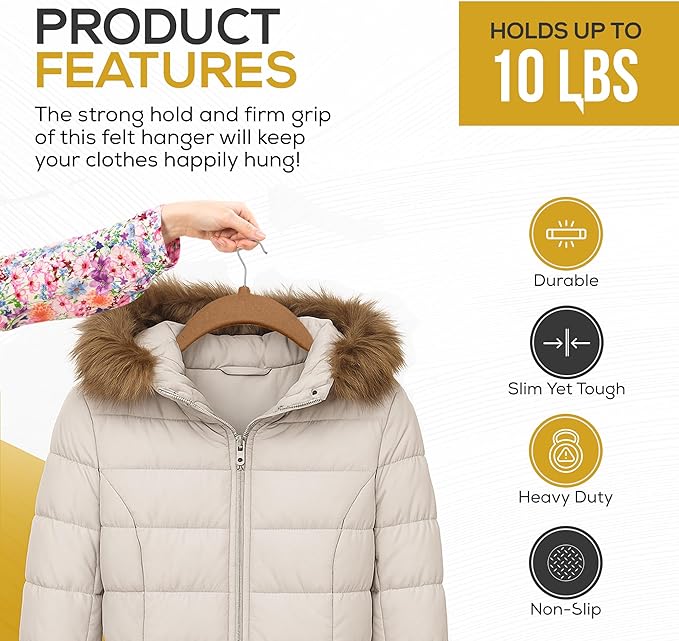- NON SLIP VELVET HANGERS : Keep your clothes neat and wrinkle free with these non slip velvet hangers. The velvet texture provides a secure grip, preventing your clothes from slipping or falling off the hanger. The notched shoulders and grooves on each hanger makes it perfect for hanging tank tops, dresses, skirts. The high quality velvet material doesn’t shed like other low quality hangers available in market.