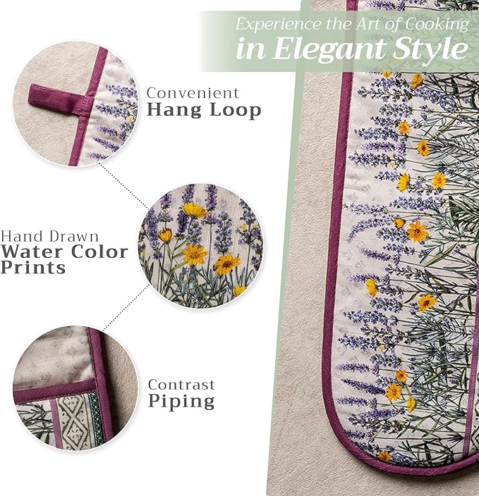 Maison d' Hermine Double Oven Mitts 100% Cotton 7"x35" Double Oven Mitt Heat Resistant BBQ Cooking Gloves with Loop, Baking, Grilling, Home, Kitchen, Handling Hot Pans Spring Summer (Fanny Lavender)