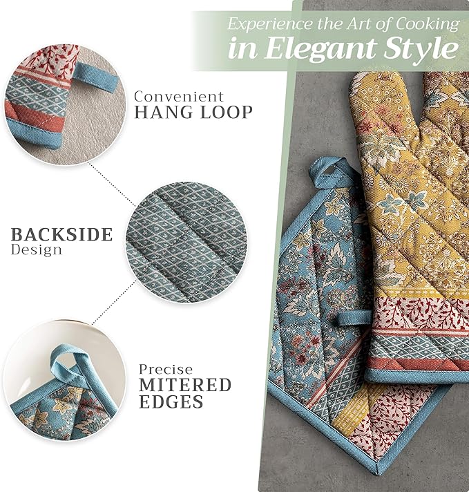 - Premium Quality: Crafted from quilted 100% cotton, this heat resistant oven mitt and pot holder set offers comfort, flexibility, and protection from hot cookware. Ideal cotton oven mitts for daily kitchen use and cooking safety