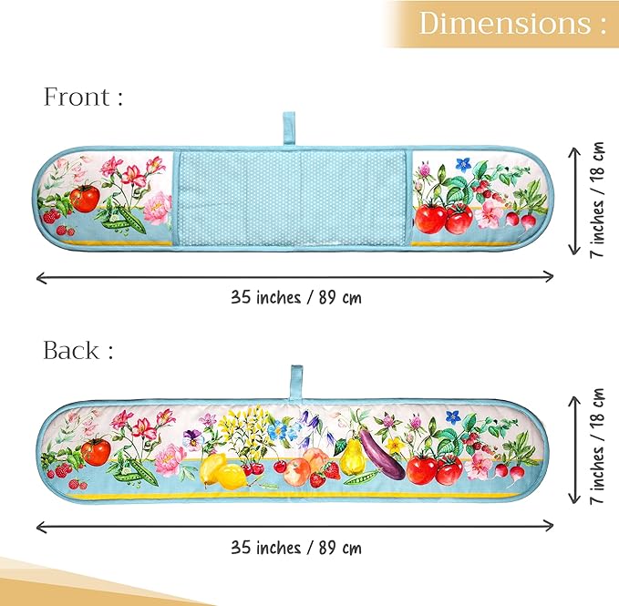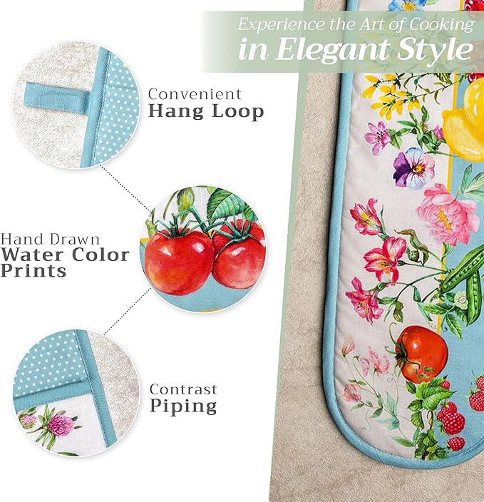 - Package includes: Includes 1 double oven mitt sized 7"x35". Perfect for handling hot cookware safely while adding a touch of European elegance to your kitchen. Designed in Europe and made in India with care