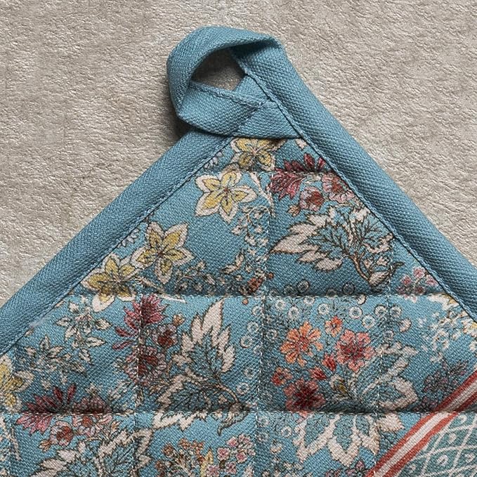 - Package includes: 2 pot holders measures 8"x8". Ideal as a hot pad for dishes, coffee pots, cast iron pans, or cookware. Designed in Europe and Made in India, it blends style, function, and comfort into a daily kitchen essential