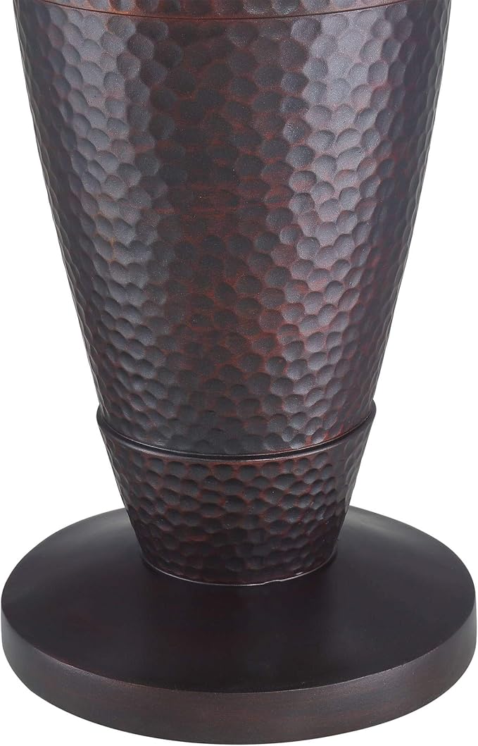 - Tempered glass tray tables. Space-saving design, use as an end table or nightstand. Oil rubbed bronze finishes on hammered metal. Oatmeal drum shades. 8-foot long brown cords.