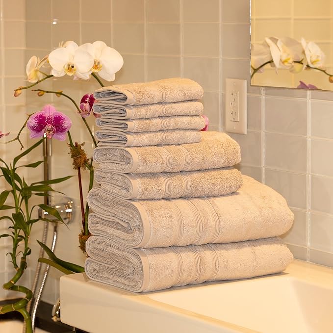 Mosobam Luxury Turkish 8pc Towel Set 30X58 16X30 13X13 Light Grey (Gray) 700 GSM Bamboo Viscose & Aegean Turkish Combed Cotton