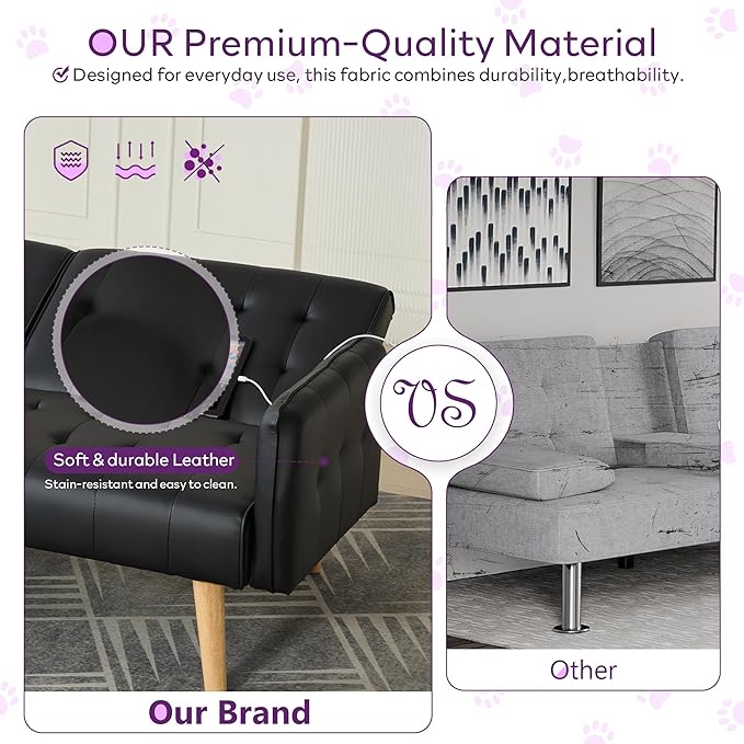 TYBOATLE Faux Leather Convertible 65'' Folding Futon Sofa Bed w/ 2 USB, Loveseat for Small Space, Apartment, Dorm, Living Room, Office, Black
