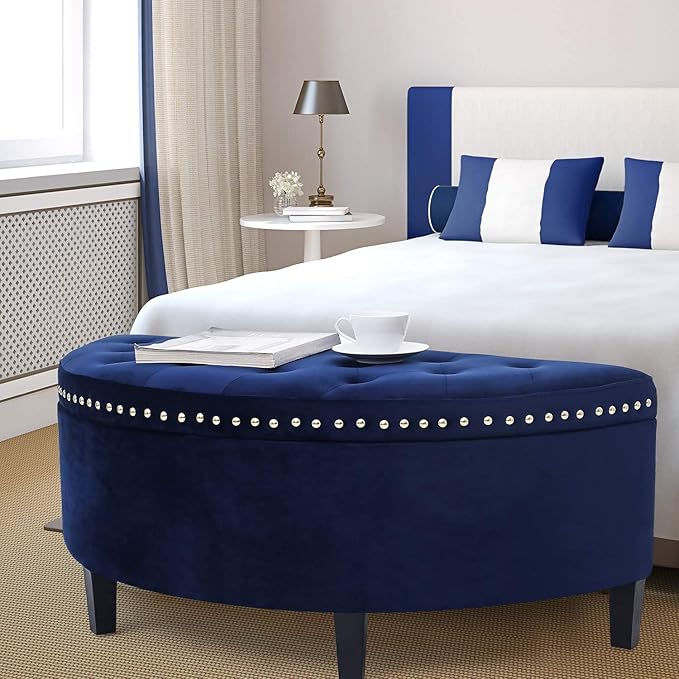 Homebeez 43.5" Half Moon Storage Ottoman Bench, Lift Top Velvet Storage Ottoman Bench for Bedroom Living Room (Navy Blue)