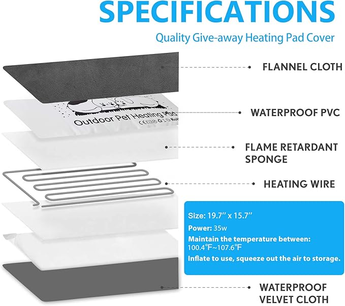 - 🐾ENERGY SAVING & SAFE 🐾 This outdoor heating pad is only 35w, thus it is more energy-savings. Anti-bite power cord design, the extra-long cord extends 5.91 feet with a 4.92 feet steel-encased chew guard. Furthermore, made of fireproof material, so it is really safe for you and your pets.