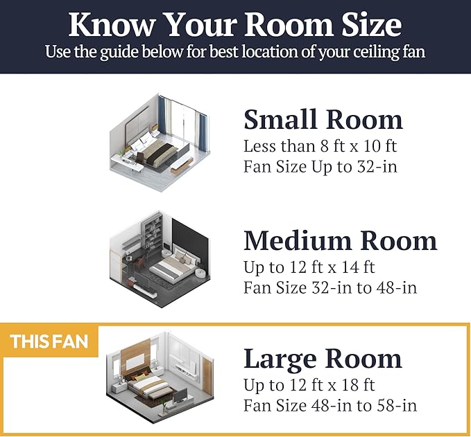- Keep Cool With The Correct Ceiling Fan Size — For ultimate performance, choose the right fan size for your room; This 52-in ceiling fan is ideal for medium to large rooms up to 400 sq. ft. such as bedrooms, dens, dining rooms, & more
