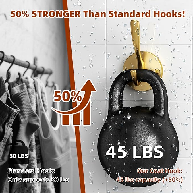 - Rust-Proof & Weatherproof: Using multi-layer electroplating process makes the towel hooks for bathrooms gold more durable, rust-resistant, waterproof and scratch-resistant, perfect for use in wet environments such as kitchens, bathrooms, gardens, porches or outdoor areas to increase storage space.
