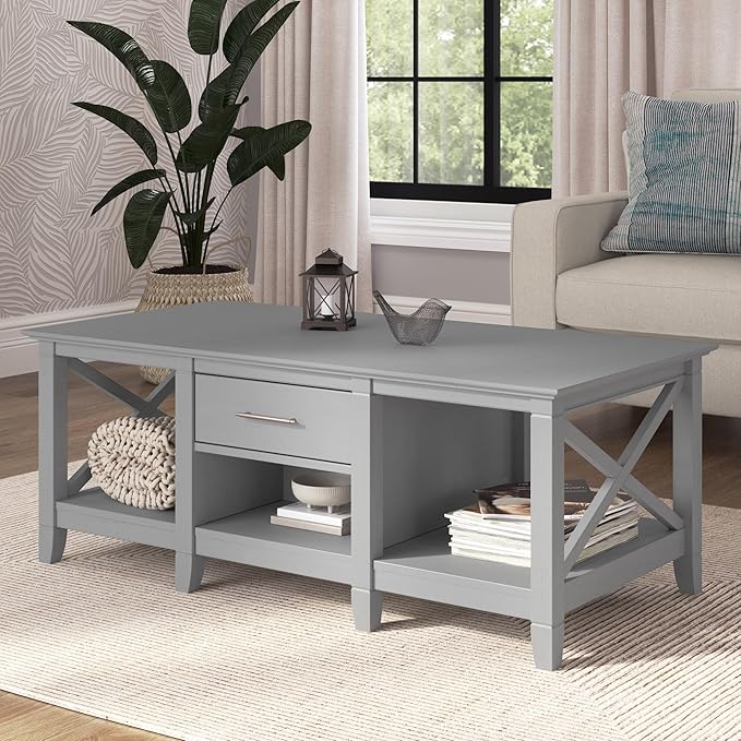 - REFRESHING HOME DECOR: Embrace a casual living space with Bush Furniture's Coffee Tables for Living Room. Our storage coffee table offers a spacious surface for coasters and magazines while box drawers and cubby spaces provide plenty of room for storage.