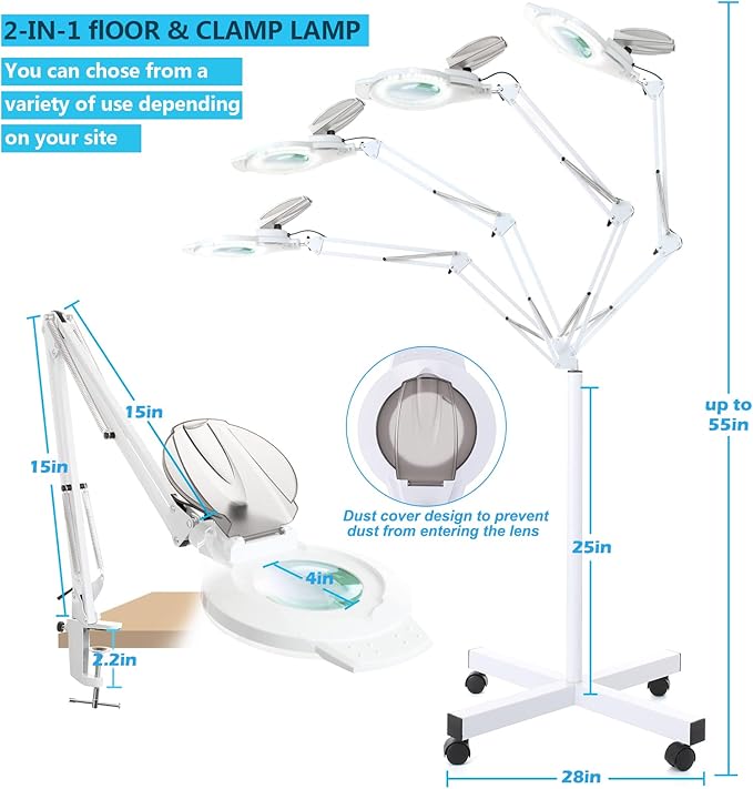 - Multifunction Floor And Clamp Lamp: Best rolling base has the advantage of 4 wheels as it glides seamlessly across carpeting, hardwood floors, and other surfaces. The cross tripod will give you excellent stability, never fall down. In addition, as a clamp lamp, the utility clamp fits snugly on a desk, worktable, or bench. Exclusive design, meet your any needs.