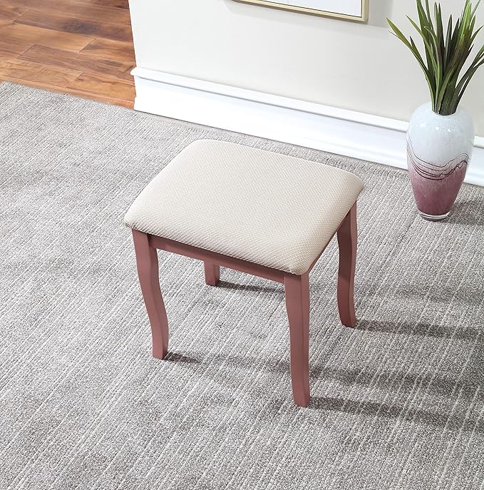 - Hand-applied rose gold finish. Ample storage space for makeups and jewelries. The matching stool is thickly padded, upholstered with a beige colored fabric