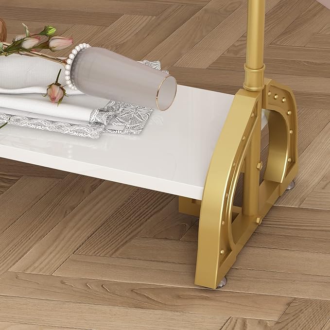 - CHIC DESIGN: Made of premium metal, each place of this retail clothing rack has been carefully treated, the lines are round and beautiful, gold appearance combine with white shelf make the adjustable clothing rack more stylish.