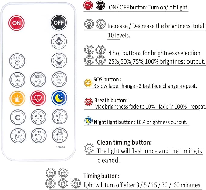 - RF Remote Control: 17-key RF remote controller with SOS mode, brightness adjustment, and more