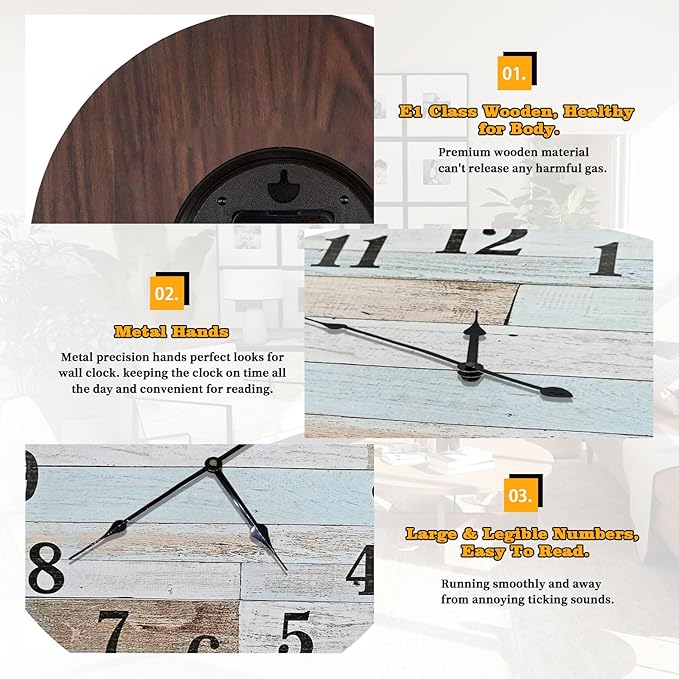 - Coastal Art Design & Natural Wood Texture:24 inch large blue wood dial and distressed craftsmanship, the natural wood texture of the back panel is clearly visible, adding ocean style and modern retro style to the living room, entrance or study