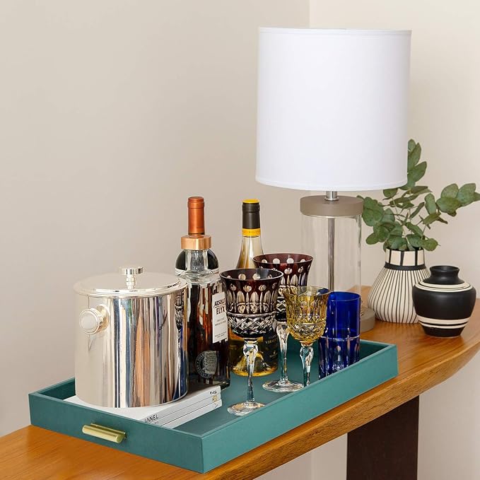 HofferRuffer Extra Large Serving Tray with Handles, Elegant Faux Leather Storage Decorative Tray for Coffee Table, Ottoman, Console Table (Green Tray+Golden Handle)