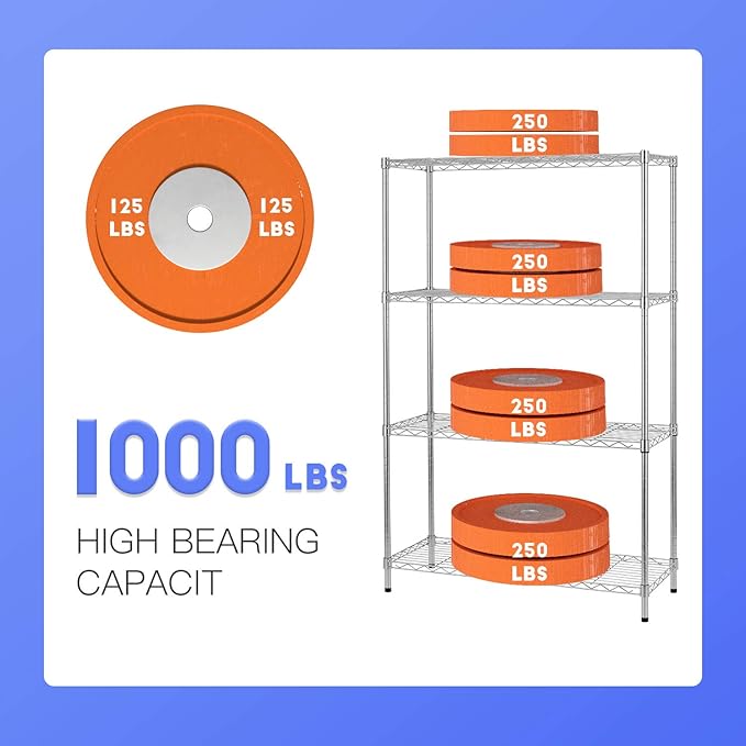 - HEAVY-DUTY LOAD CAPACITY: This metal shelf supports up to 1000 lbs total (250 lbs per shelf), making it ideal for garage shelving, pantry shelves, and heavy duty shelving applications.
