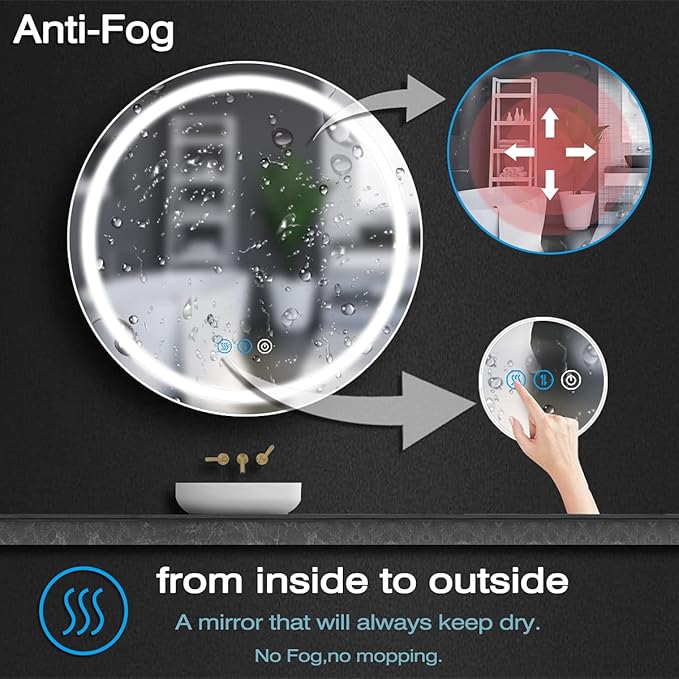 - 👆【Adjustable Brightness & 3 Colors】This round bathroom LED mirror light is dimmable, the button will be blue in a dark environment. Simply touch the round button for 3 seconds to change brightness. Meet your habits with 3 colors light, warm light /day light /cold light that will give you a strong light for personal care or a gentle light as a ambient light. The anti-fog is separately controlled by a button, turn on/off, it is the high quality life choice with no more foggy mirrors.