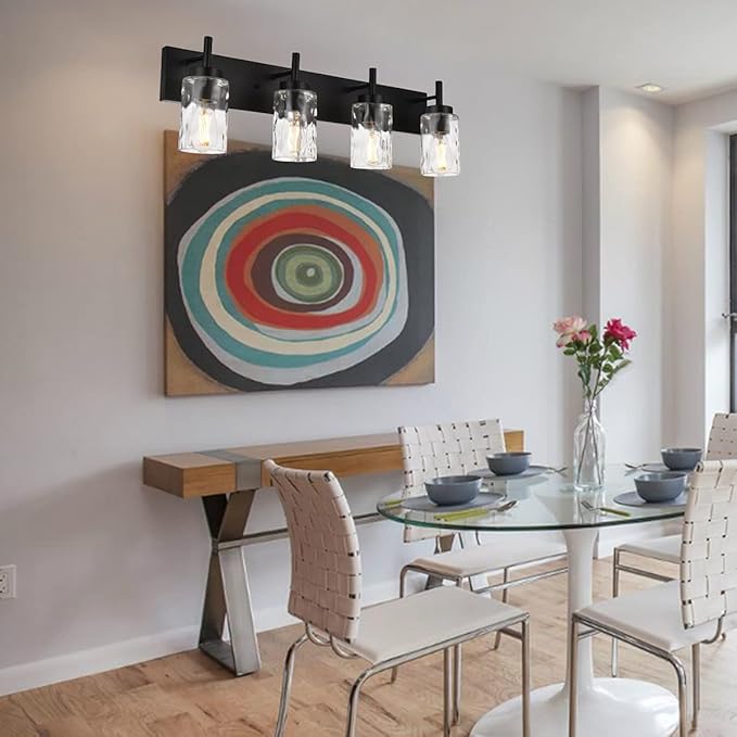 - 1️⃣Modern & Unique Design:This 4-light wall vanity light fixture has clear hammered glass shades and a rich finish that creates a farmhouse look in your space.The glass shades bring a refined vintage feel to any room and simple yet elegant metal finish with clear hammered glass shades lends itself to placement in a bathroom, entryway, or dining room, bringing a modern farmhouse vibe to space.It can be mounted in the up or down position.