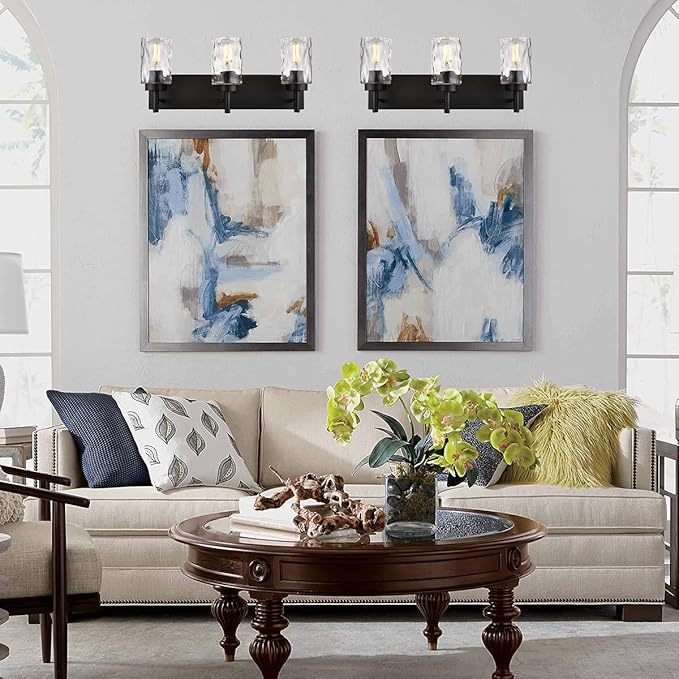 - 1️⃣Modern & Unique Design:This 3-light wall vanity light fixture has clear hammered glass shades and a rich finish that creates a farmhouse look in your space.The glass shades bring a refined vintage feel to any room and simple yet elegant metal finish with clear hammered glass shades lends itself to placement in a bathroom, entryway, or dining room, bringing a modern farmhouse vibe to space.It can be mounted in the up or down position.