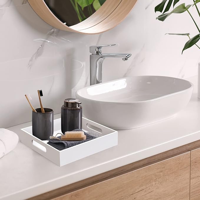- DECORATIVE STORAGE TRAY: The Timeless Look Trays Can Perfect Decorate Your Home. It Can Be Used as A Bathroom Vanity Tray, Makeup Tray Organizer, Kitchen Condiment tray, Coffee Table Organizer Tray or Nightstand Tray.