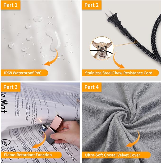 - ❤【Safety and Secure Structure】7-layer protective structure with UL-certified heating wire protect pets from burns. Soft PVC envelope with waterproof and flame-retardant function. Built-in intelligent temperature sensor in the heating pad to prevent overheating to protect pets. Don’t let your pets lay on the pet heating pad without a plush cover.