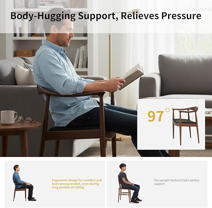 - 【Ergonomic Backrest for Lasting Comfort】:The scientifically contoured backrest is designed to align with and support the natural curve of your spine. As a thoughtfully designed dining chair with arms, it effectively reduces pressure on the lower back, promoting a comfortable and healthy posture—whether you're using it as a wishbone dining chair for style or a functional midcentury modern dining chair for long sittings