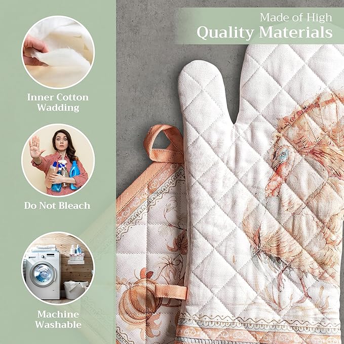 Maison d' Hermine 100% Cotton Oven Mitt & Pot Holder Set (7.5"x13" & 8"x8") Heat Resistant BBQ Cooking Gloves with Loop for Thanksgiving Christmas Decorations Handling Hot Pans (Giving Thanks)