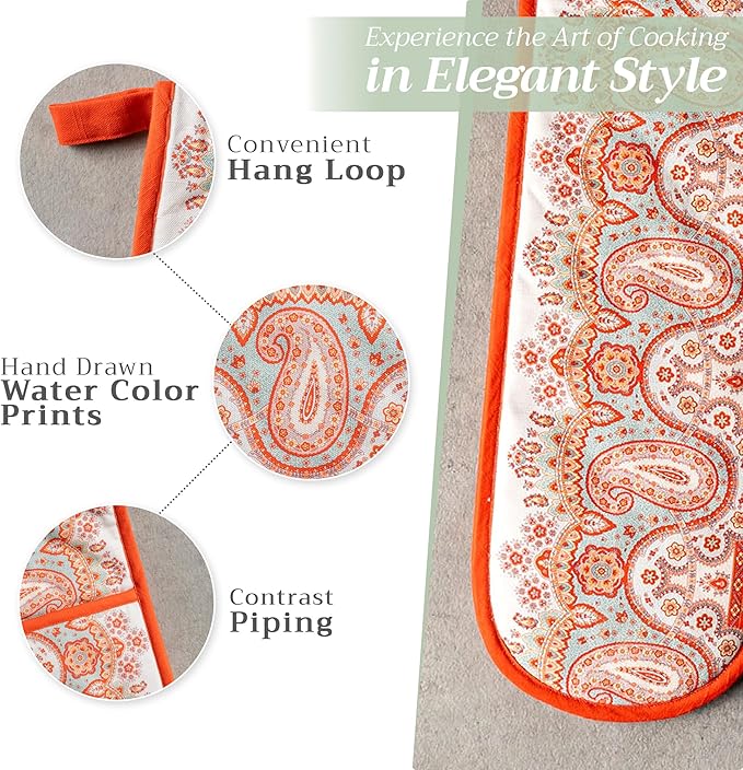 - Premium Quality: Crafted from quilted 100% cotton, this heat-resistant double oven mitt protects your hands and forearms from hot cookware. It features a built-in hanging loop for easy storage and quick access. This versatile set is perfect for everyday home kitchens, farmhouse kitchens, hotels, restaurants, and bakeries