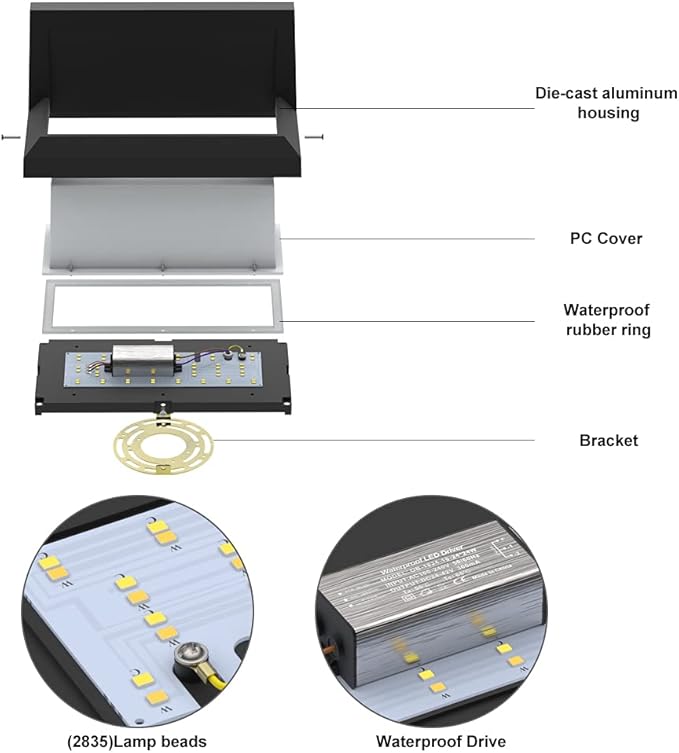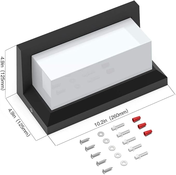 - 【Patio Wall Light Fixture With US Standard Bracket】:Size: L 10.2" x W 4.9" x H 4.9", Input Voltage :AC85-265V. Wattage: 24W. Light source: 48*LED chips included. Electric Hard-wired with wall lamp bracket, Contains all installed accessories and installation instructions.