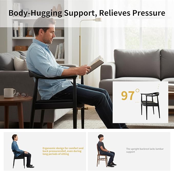 - 【Ergonomic Backrest for Lasting Comfort】:The scientifically contoured backrest is designed to align with and support the natural curve of your spine. As a thoughtfully designed dining chair with arms, it effectively reduces pressure on the lower back, promoting a comfortable and healthy posture—whether you're using it as a wishbone dining chair for style or a functional midcentury modern dining chair for long sittings
