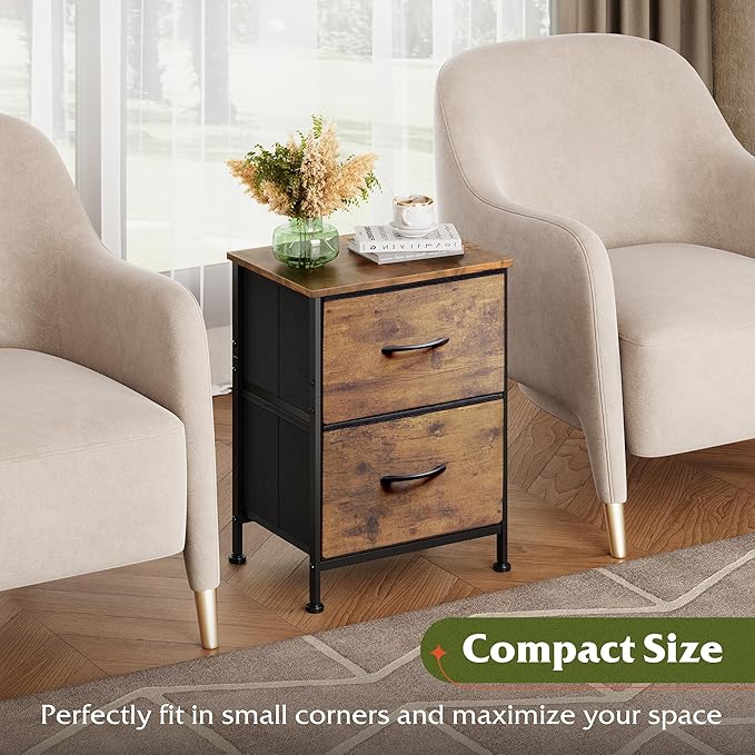 WLIVE Night Stand, Small Dresser with 2 Drawers & Wooden Top, Nightstand with Fabric Bins, Bedside Table End Table for Bedroom, Closet, Entryway, College Dorm, Rustic Brown