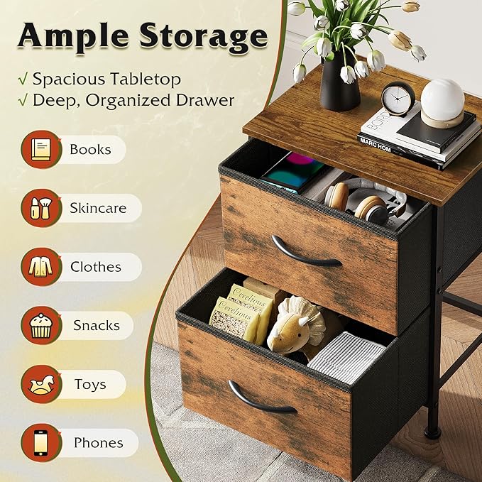 - 【2 Fabric Drawers】This compact nightstand features 2 removable storage drawers that keep your bedtime essentials, books, electronics, or clothes neatly organized and within easy reach. It's perfectly sized for cozy bedrooms, dorms, and apartments.