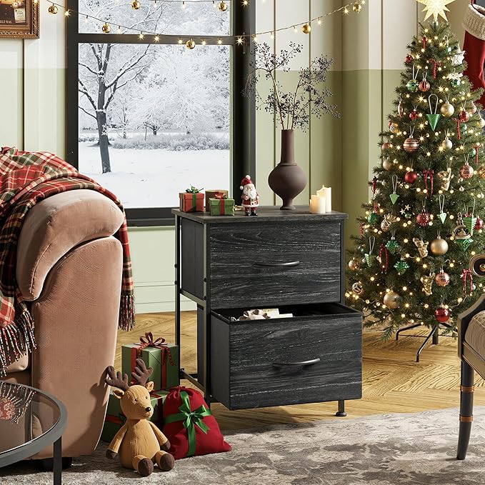 - Spacious Storage: The 2 fabric drawers of the small dresser offer large storage space for nighttime necessities. The wood top is ideal to place alarm clock, phone, charger, eyeglasses, keeping them in your reach.