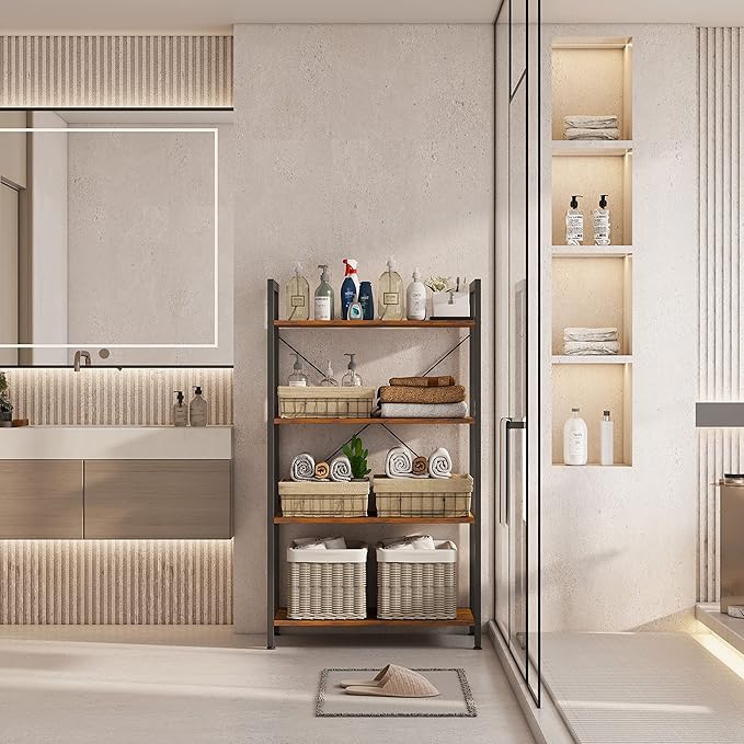 4-Tier Bookshelf, 47.2'' H Ladder Shelf, Industrial Bookcase, Wooden and Metal Storage Rack, Shelving Unit for Living Room Entryway Office, Rustic Brown Book Shelves, 24 * 11.8 * 47.2 inches