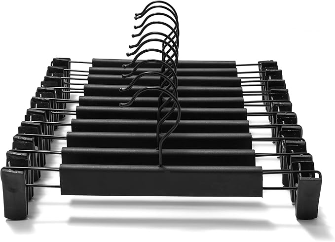10 Pack Clothes Pants Hangers, Space-Saving Skirt Holders with 360 ° Swivel Hooks, Adjustable Clips, Trouser Coat Garment Jeans Black