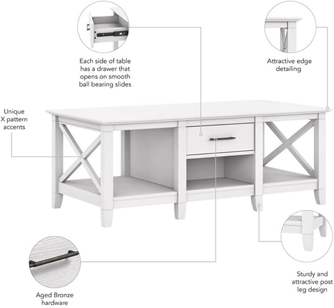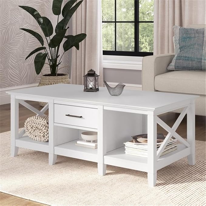 - REFRESHING HOME DECOR: Embrace a casual living space with Bush Furniture's Coffee Tables for Living Room. Our storage coffee table offers a spacious surface for coasters and magazines while box drawers and cubby spaces provide plenty of room for storage.