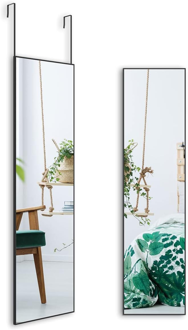 ANYHI Over The Door Mirror, 47" x 12" Black Full Length Mirror for Door, 2 Hooks, Aluminum Frame, Door Hanging or Wall Mounted for Bedroom Bathroom Checkroom