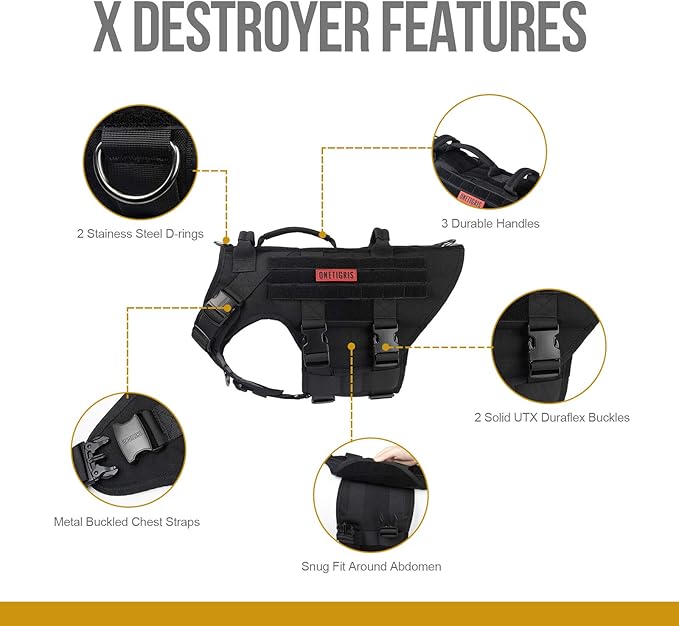 - QUALITY AFTER-SALE GUARANTEE: OneTigris large tactical dog harness(X DESTROYER Harness) have 1 year wty. If you are not satisfied with dog vest harnesses, feel free to reach out and we will reply in 24 hours