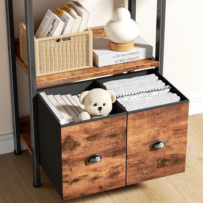 Furologee 5-Tier Bookshelf, Tall Bookcase with 2 Storage Drawers, Adjustable Industrial Display Standing Shelf Units, Wood and Metal Storage Rack for Living Room, Bedroom, Home Office Rustic Brown