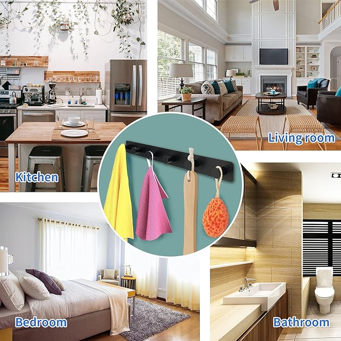 - The wall coat rack with 6 black hooks for hanging coats, clothes, hat, towels, jacket, backpack, robe, entryway, bedroom, bathrooms, mudroom, kitchen,etc.