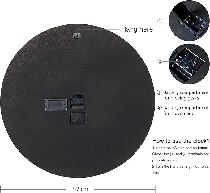 - Battery Operated: The clock hands and the gears are operated by two separate battery compartments, 2 AA batteries for the wheels, 1 AA battery for the clock hands, they can run simultaneously or independently (Note: Battery is not provided.)