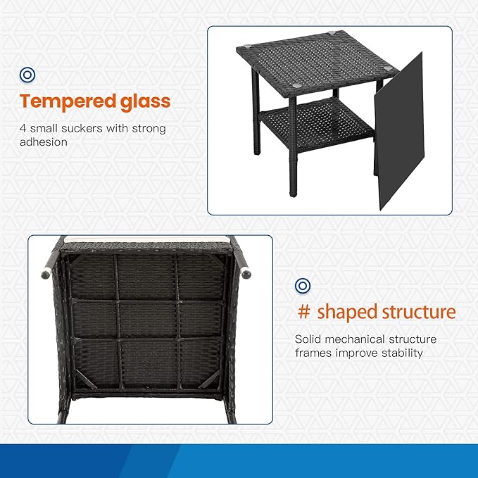 - MODERN STYLE: The patio set includes a table made of high-quality tempered glass for drinks, food, or dรฉcor. This sleek rattan design brings modern elegance and style to your outdoor furniture space.