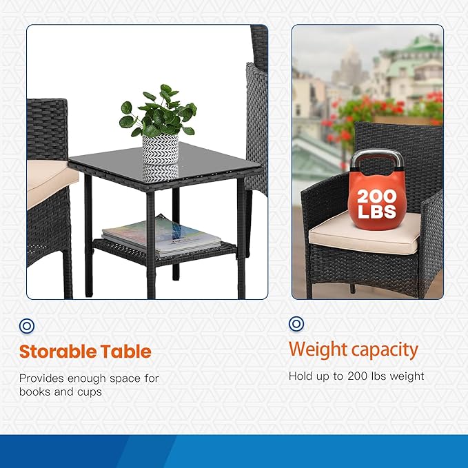 - SPACE-SAVING & VERSATILE: This patio conversation set fits small patios, balconies, and gardens. Compact and practical, this design saves space while providing easy storage for outdoor essentials.