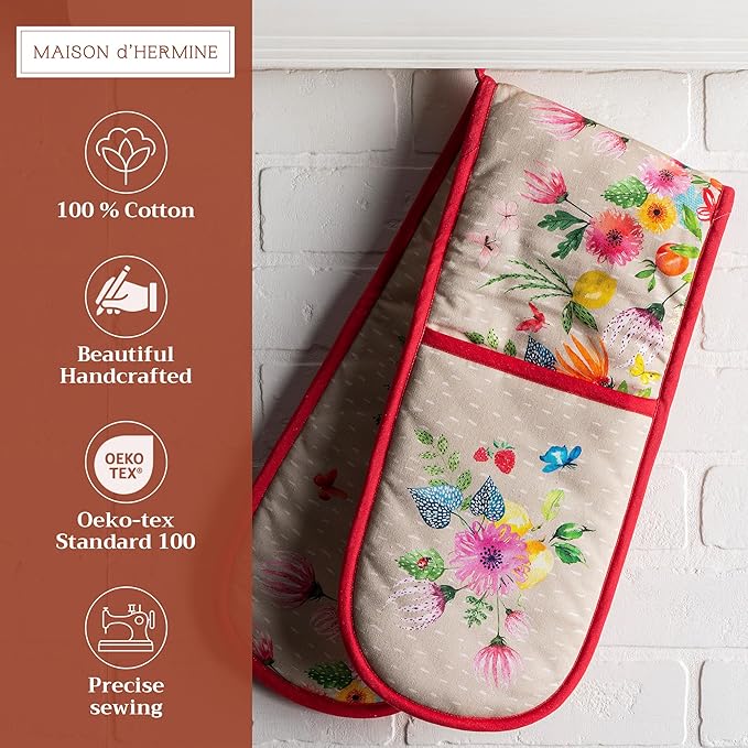 Maison d' Hermine Double Oven Mitts 100% Cotton 7"x35" Double Oven Mitt Heat Resistant BBQ Cooking Gloves with Loop, Baking, Grilling, Kitchen, Handling Hot Pans Spring Summer (Jardin D'Ete - Fog)