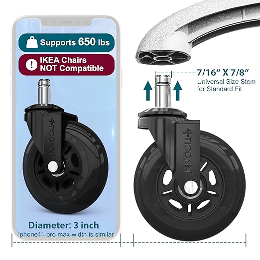 TICONN Office Chair Caster Wheels Set of 5 for Tile, Hardwood Floors and Carpets, Universal Fit for Most Chairs (Black)