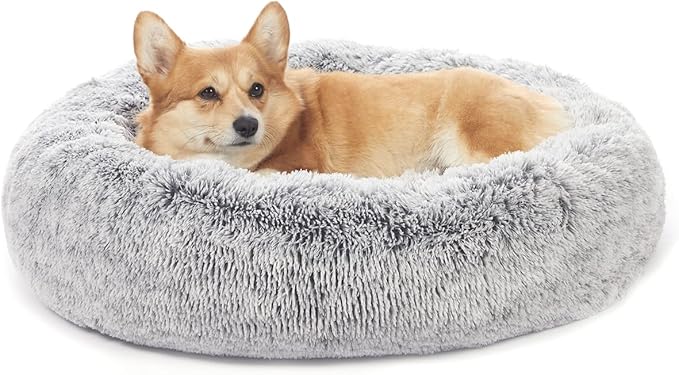 Bedfolks Calming Donut Dog Bed, 30 Inches Round Fluffy Dog Beds for Medium Dogs, Anti-Anxiety Plush Dog Bed, Machine Washable Pet Bed (Dark Grey, Medium)