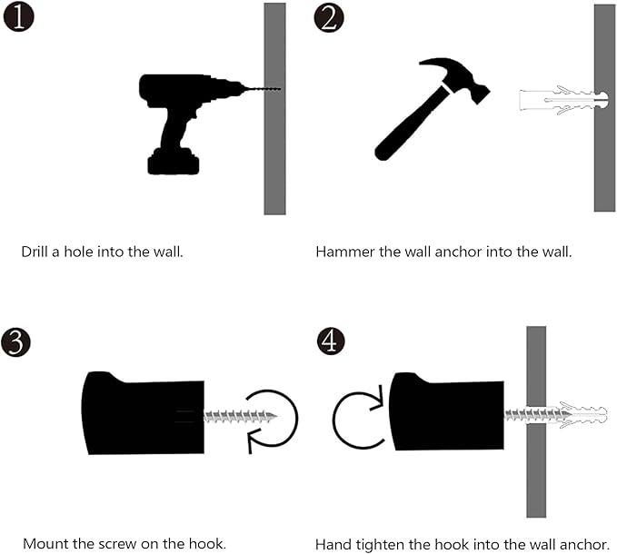 - EASY TO INSTALL: There is pre-drilled mounting hole on the hook, just drill a hole on the wall, knock into a wall anchor, install screw in the hook and then tighten it on the wall. Comes with required mounting screws and anchors.